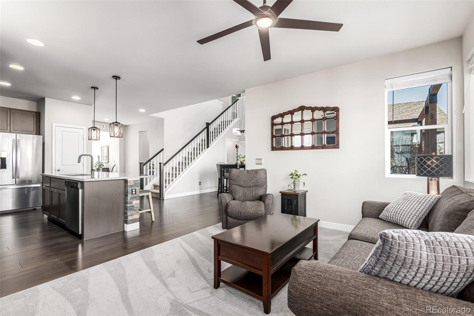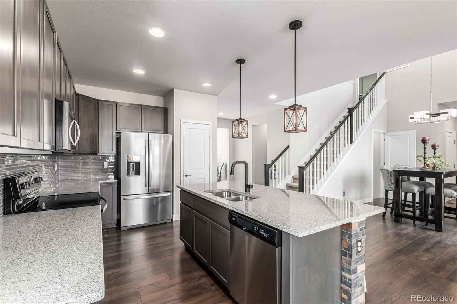 Stunning contemporary home featuring a gorgeous facade with stone accents and a sizeable front yard. Inside enjoy high ceilings, wood-look flooring, a cozy fireplace, and a gourmet kitchen equipped with ample cabinetry, pantry, granite counters, tile backsplash, stainless steel appliances, and a center island. Upstairs you'll find a spacious loft, a luxurious primary suite with dual sinks and walk-in closet, plus two additional bedrooms. The unfinished basement offers endless potential. Outside, enjoy a meticulously landscaped backyard with a patio and storage shed. WiFi-programmed sprinkler system and garage door opener included.